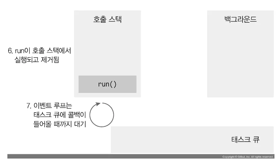 호출 스택이 비어있으므로, 이벤트 루프는 태스크 큐에서 run 함수를 가져와 호출 스택에 넣고 실행한다.