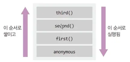 first 함수 → second 함수 → third 함수 순으로 호출이 되고, 호출된 순서와는 반대로 실행이 완료된다.