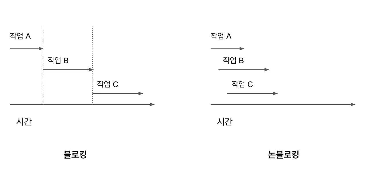 그림 1.6을 보면 작업들이 모두 동시에 처리될 수 있는 작업이라는 전제하에, 블로킹 방식보다 논블로킹 방식이 같은 작업을 더 짧은 시간에 처리한다는 것을 알 수 있다.