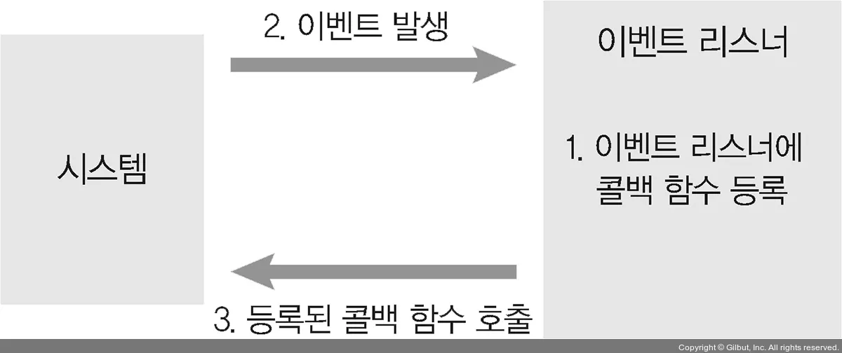 이벤트 기반 시스템에서는 특정 이벤트가 발생할 때 무엇을 할지 미리 등록해둬야 한다. 이를 이벤트 리스너(event lisener)콜백(callback) 함수를 등록한다고 표현한다. 버튼을 클릭할 때 경고창을 띄우도록 설정하는 것을 예로 들어보자. 클릭 이벤트 리스너에 경고창을 띄우는 콜백 함수를 등록해두면 클릭 이벤트가 발생할 때마다 콜백 함수가 실행돼 경고창이 뜨는 것이다.