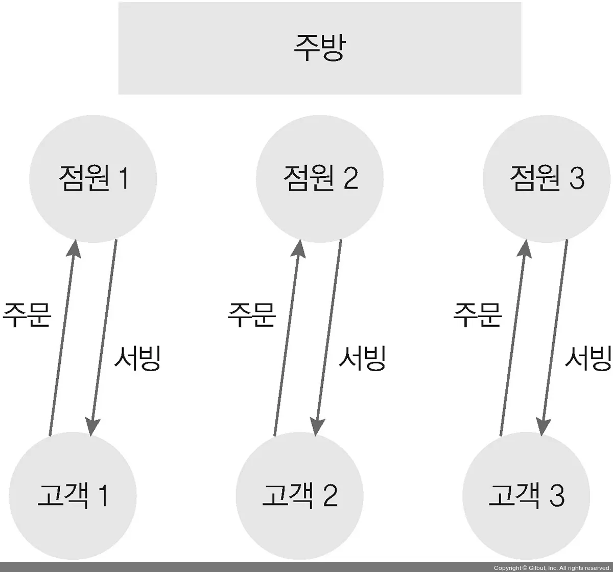 이런 구조라면 다음 손님은 이전 손님의 요리가 나올 때까지 아무 것도 하지 못하고 기다리고 있어야 한다. 이것이 바로 싱글 스레드(점원), 블로킹 모델이다. 매우 비효율적이다.