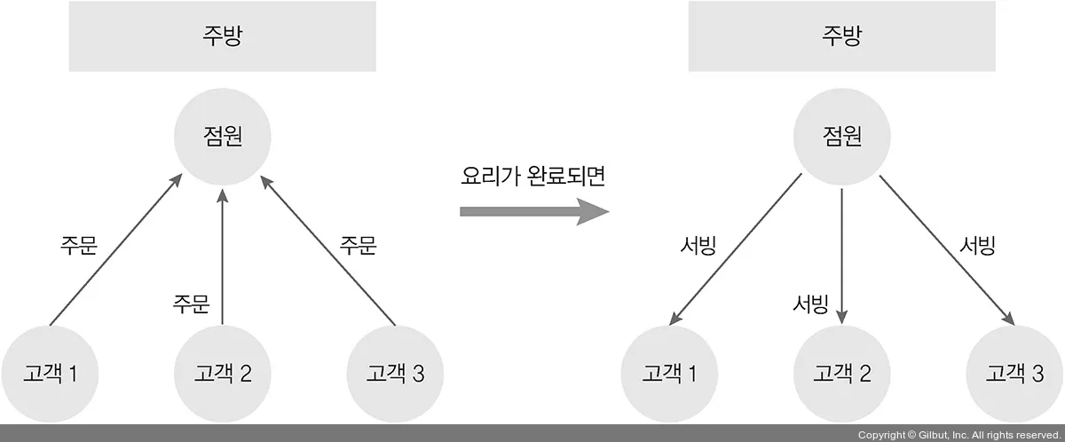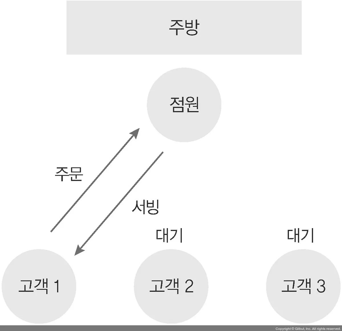 이런 구조라면 다음 손님은 이전 손님의 요리가 나올 때까지 아무 것도 하지 못하고 기다리고 있어야 한다. 이것이 바로 싱글 스레드(점원), 블로킹 모델이다. 매우 비효율적이다.