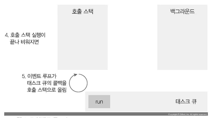 호출 스택이 비어있으므로, 이벤트 루프는 태스크 큐에서 run 함수를 가져와 호출 스택에 넣고 실행한다.