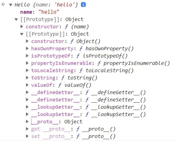 Hello에 정의한 name 멤버 외에 프로토타입 객체인 Object의 다른 멤버들도 존재함을 알 수 있다.