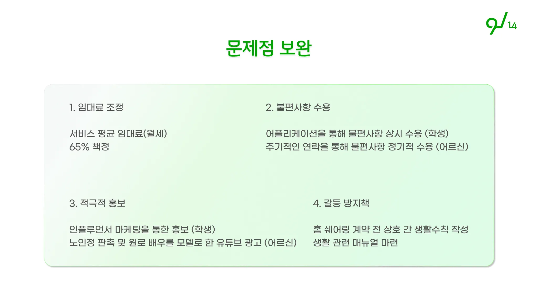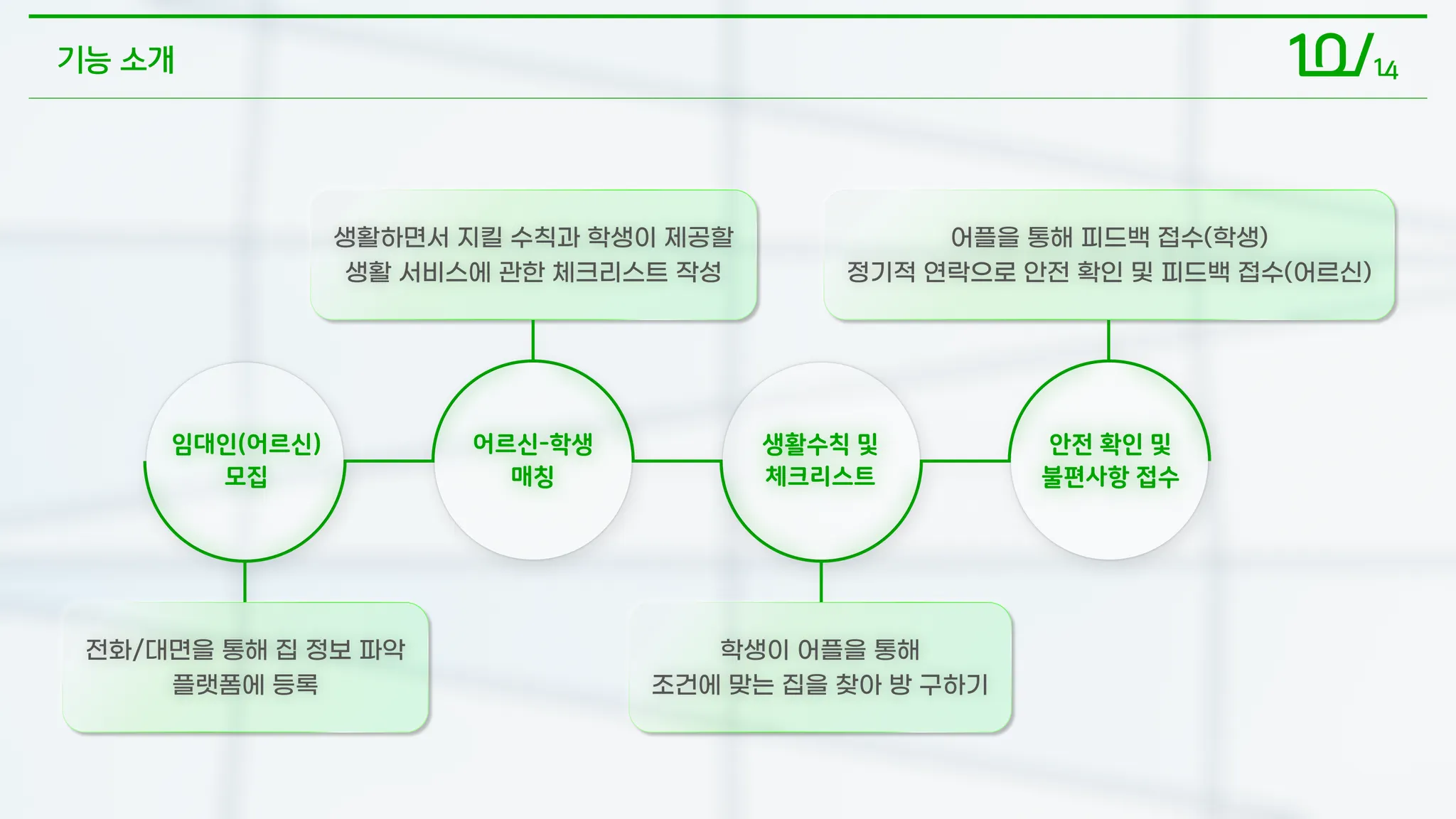 ‘그랜파’를 통해 독거노인에게는 외로움을 해소하고, 고독의 굴레에서 벗어날 수 있는 기회를, 대학생에게는 학교와 가까운 위치의 주거 공간을 저렴한 가격으로 확보할 수 있는 기회를 제공한다. 기존 지자체가 진행하는 홈쉐어링 사업의 단점을 보완하여 독거노인과 대학생 모두가 만족할 수 있는 홈쉐어링이 이루어질 수 있도록 한다.