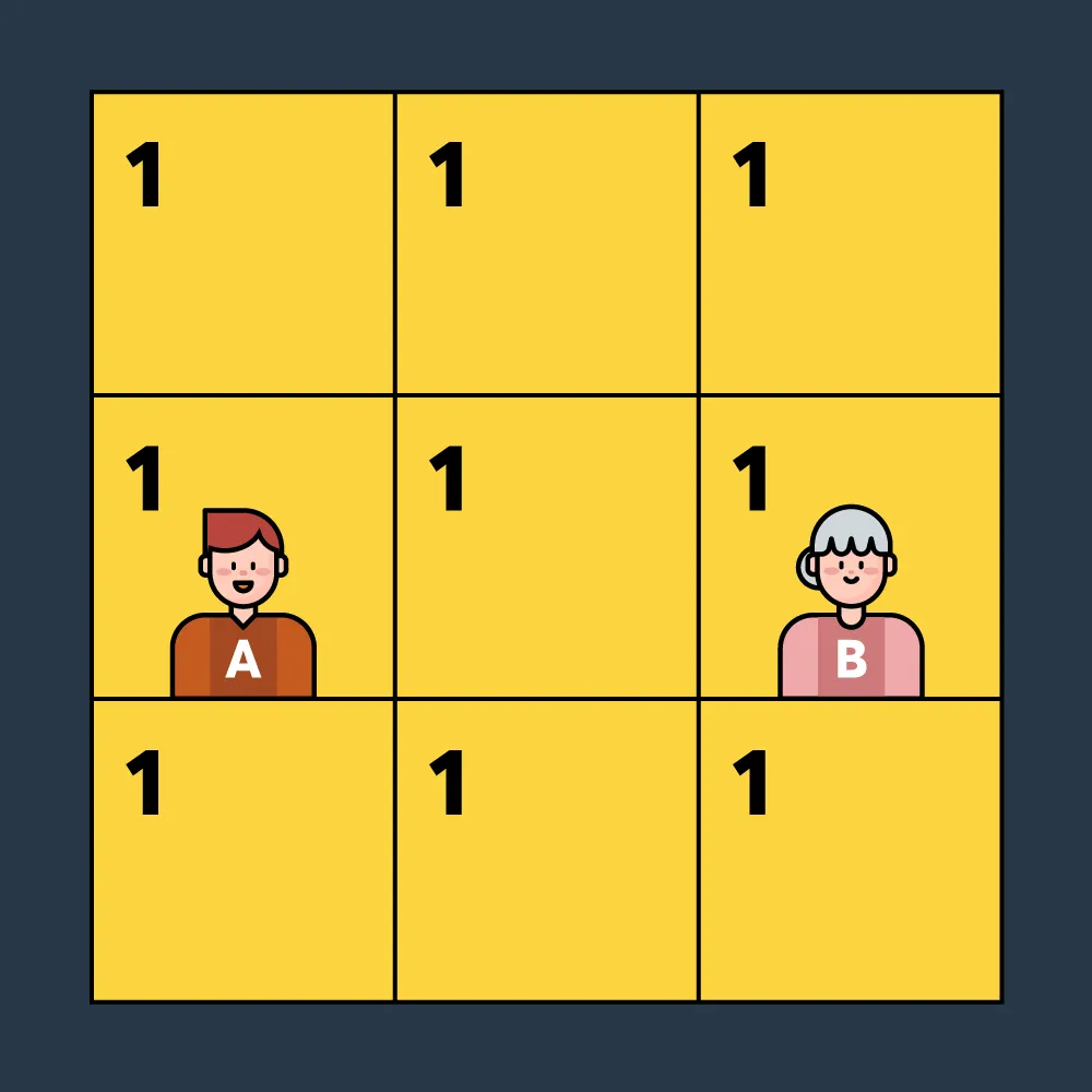 [[1, 1, 1], [1, 1, 1], [1, 1, 1]] | [1, 0] | [1, 2] | 5 |