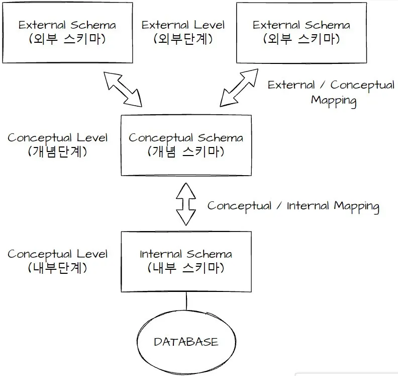 초창기 데이터베이스 아키텍처는 internal schema, external schema만 있었음