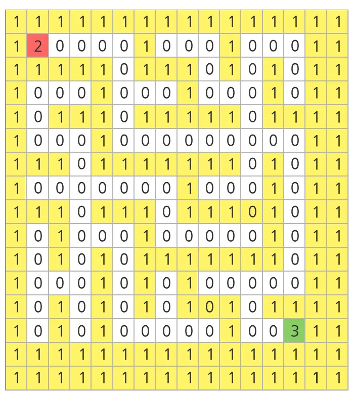 행렬에서 0은 길, 1은 벽, 2는 출발점, 3은 도착점을 의미