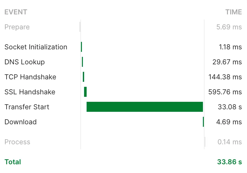Postman의 응답 시간을 보면, 초기 연결 과정(TCP Handshake, SSL Handshake)은 약 0.74초가 걸렸지만, 실제 데이터 전송(Transfer Start)에 33초가 걸렸다.